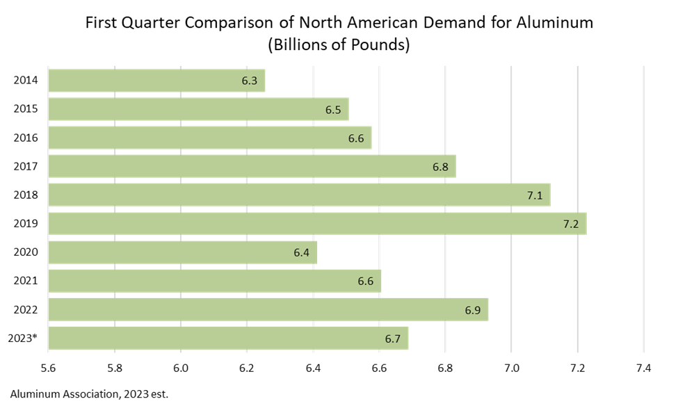 - Aluminum demand in the United States and Canada (shipments by domestic producers plus imports) totaled an estimated 6.1 million pounds in the first quarter compared to 6.5 million in the first quarter of 2022.